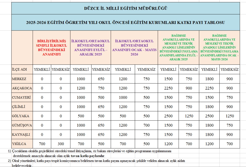 Düzce İl Milli Eğitim Müdürlüğünün Belirlediği Okul Öncesi Katkı Payı Çizelgesi doğrultusunda Okulumuz 2025/2026 Eğitim Öğretim Yılı Ücreti Aylık 1000 TL'dir.